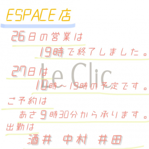 明日、27日(日)は10時〜19時の営業予定とさせて頂きます。